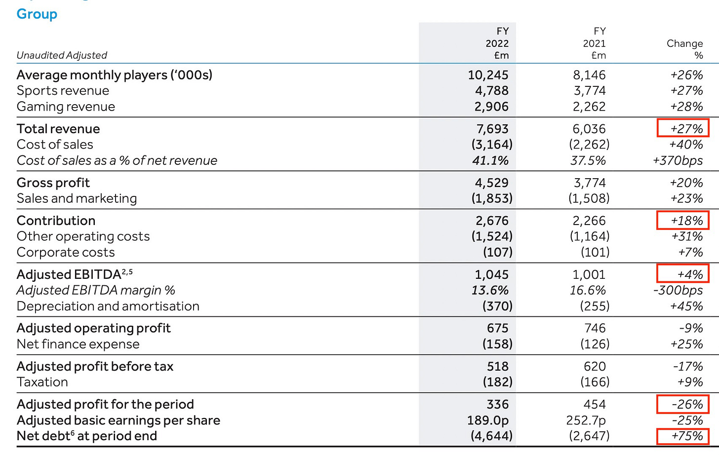 由於併購案的需要,公司在 2022 年的淨負債 (Net Deb) 從 2021 年的 26.4 億英鎊上升到 2022 年的 46.4 億英鎊,增加了 75%。