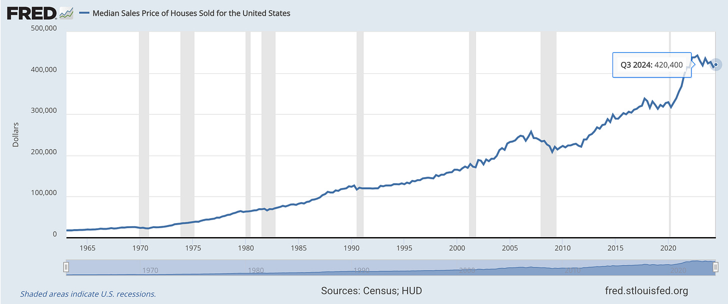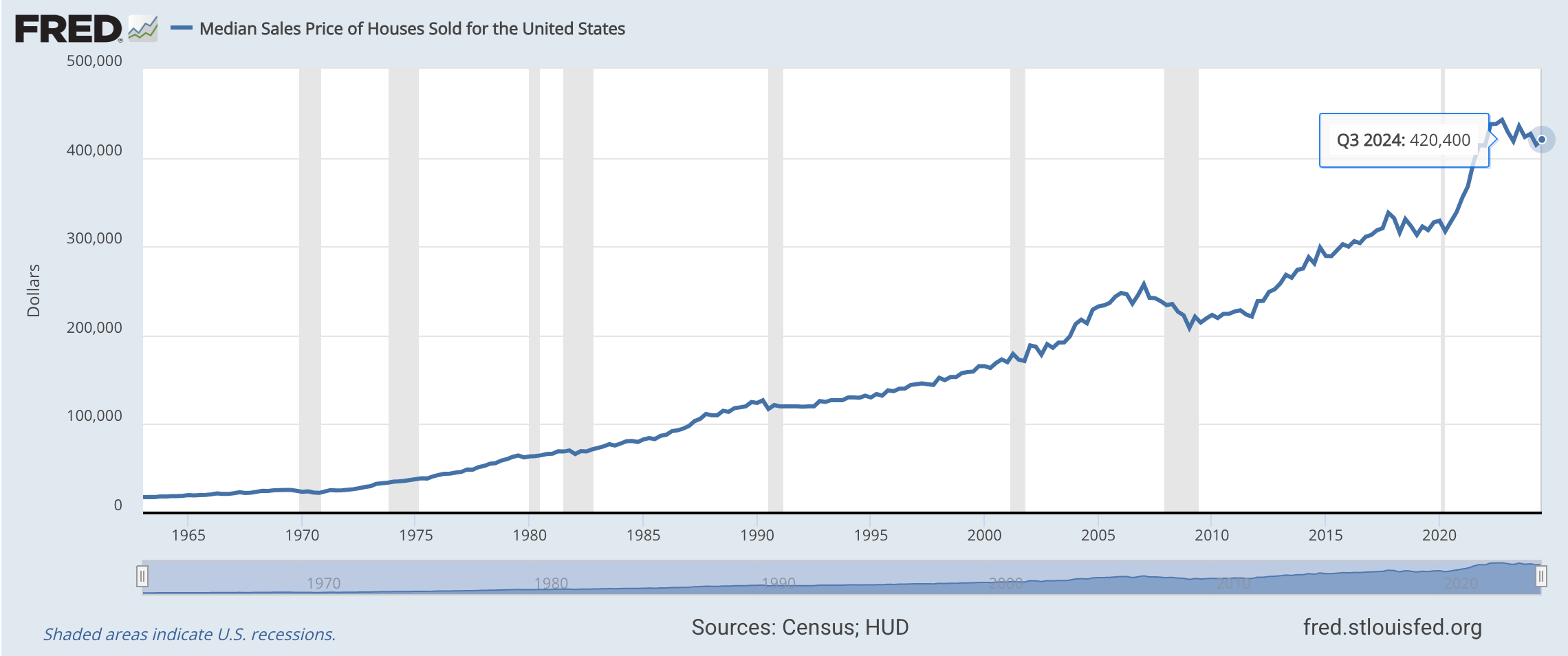 同期間,美國房價的中位數從 1959 年的 12,400 美元上漲到 2024 年的 420,400 美元(表九)。65 年間,房價上漲的複合年成長率達 5.57%,非常接近貨幣供給的成長率。