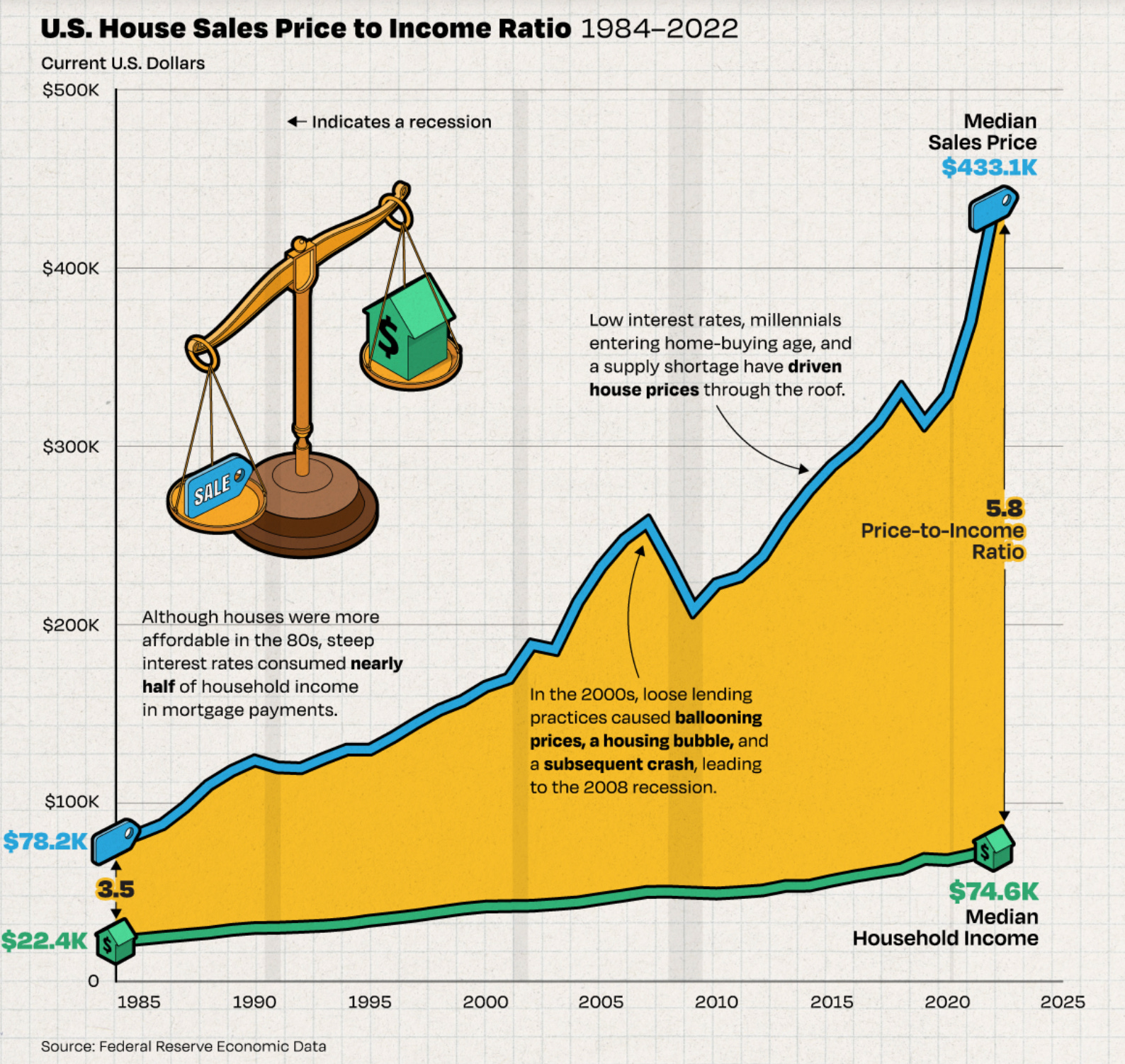 從 1985 年到 2022 年,美國房價的中位數從 78,200 美元上漲到 433,100 美元,過去 40 年的平均漲幅約 5%。在台灣,從 2002 年 3 月到 2024 年 9 月,台灣的房價每年平均更是增長了 7.3%。美國的房價的升幅雖然較低,但是,也正在漸漸脫離一般人購買力的範圍,而東亞各國的人們早已經飽受房價上漲的折磨。長期來看,貨幣在資產目前貶值的宿命,已經難以改變。