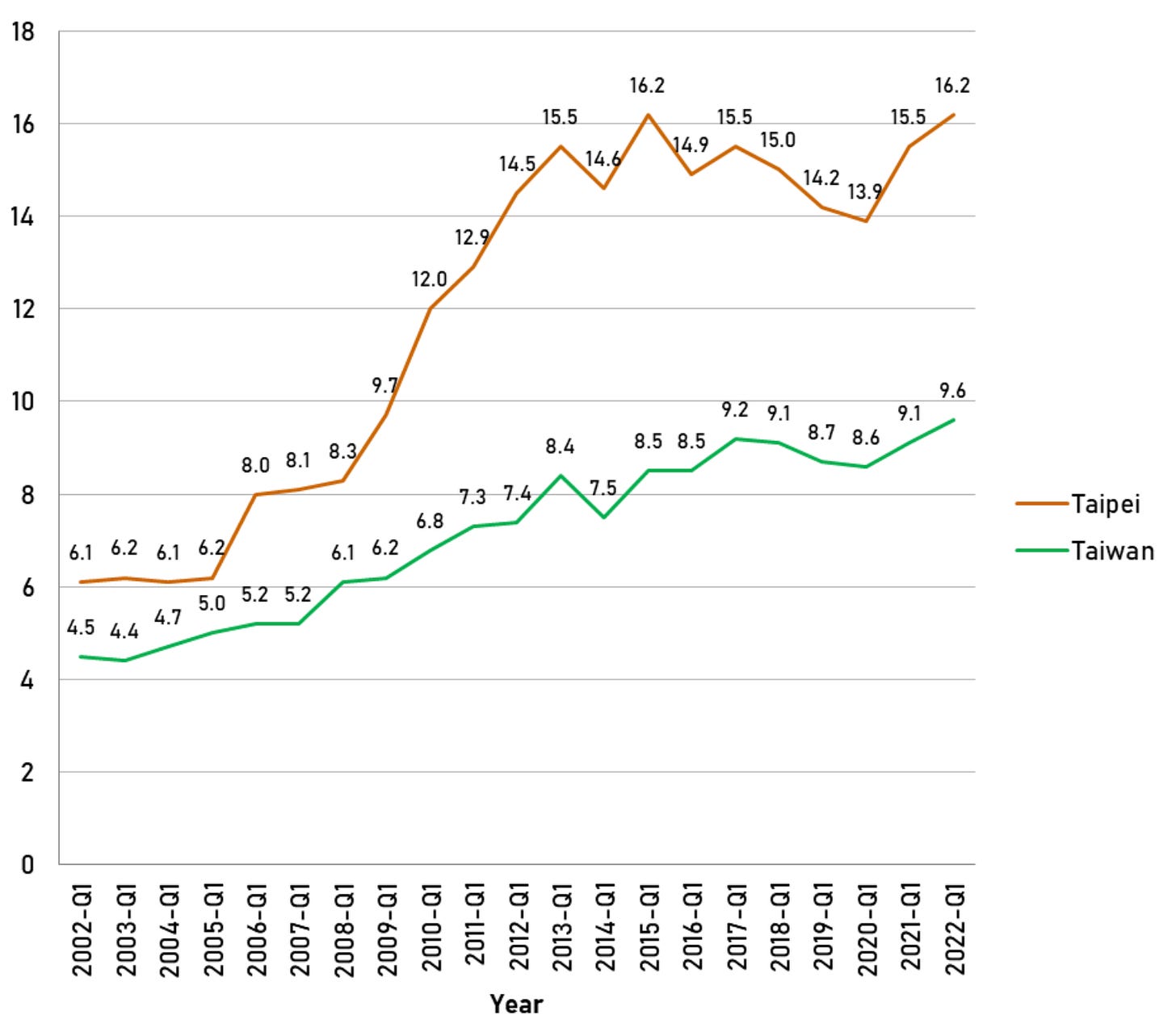 從收入面來看,從 1985 年到 2022 年,美國的平均家庭收入從 22,400 美元上升到 74,600 美元,平均增幅為 3.3%。換句話說,美國家庭薪資的增幅勉強跟上了通貨膨脹,但跟不上房價。房價收入比從 3.5 倍上升到 5.8 倍(表六)。台灣低薪的情況嚴重,房價收入比更是從 2022 年的 4.5 倍上升到 2022 年的 9.6 倍(台北為 16.2 倍,表七)。換句話說,受薪階級受到的打擊是雙重的,除了通貨膨脹以外,還要面臨薪資漲幅跟不上資產價格的上漲。