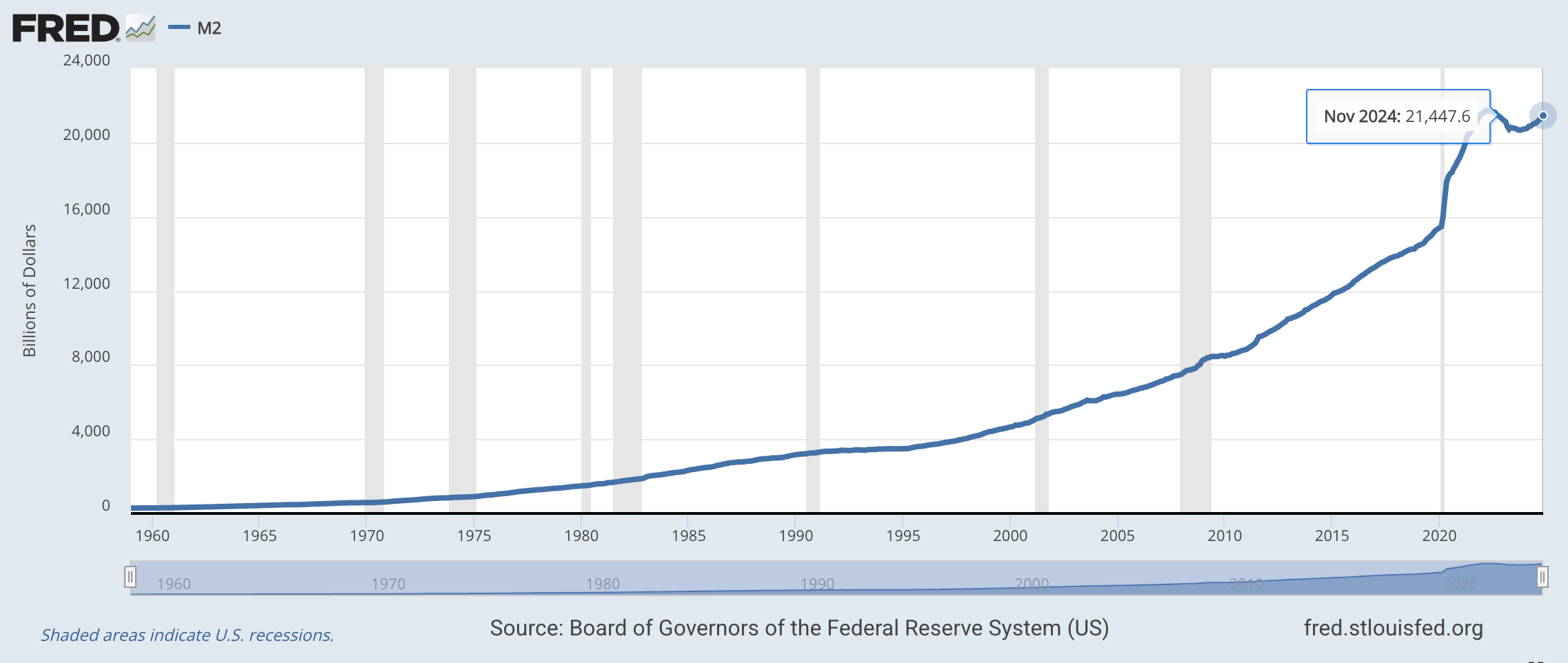 美國 M2 的貨幣供給量從 1959 年的 2,866 億美元上升到 2024 年的 214,476 億美元(21.5 兆美元)。65 年間,貨幣供給的複合年成長率高達 6.86%(表八)。