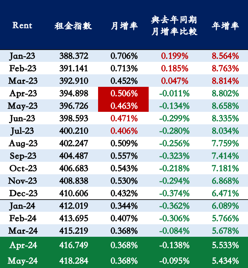租金通膨在去年 3 月才達到 8.814% 的峰值。儘管如此,在去年 4 月和 5 月,租金通膨的月增率仍然高達 0.506% 與 0.463%。