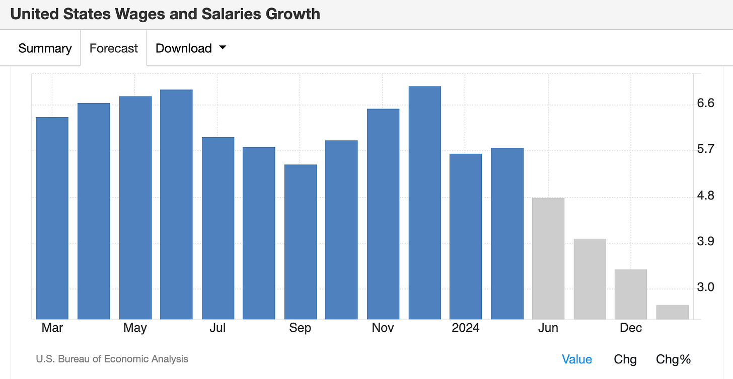 接下來的 4 月和 5 月,核心 PCE 在去年同期的月增率進入更低的 0.307% 和 0.288%,通膨最後一哩的下降,充滿了挑戰。