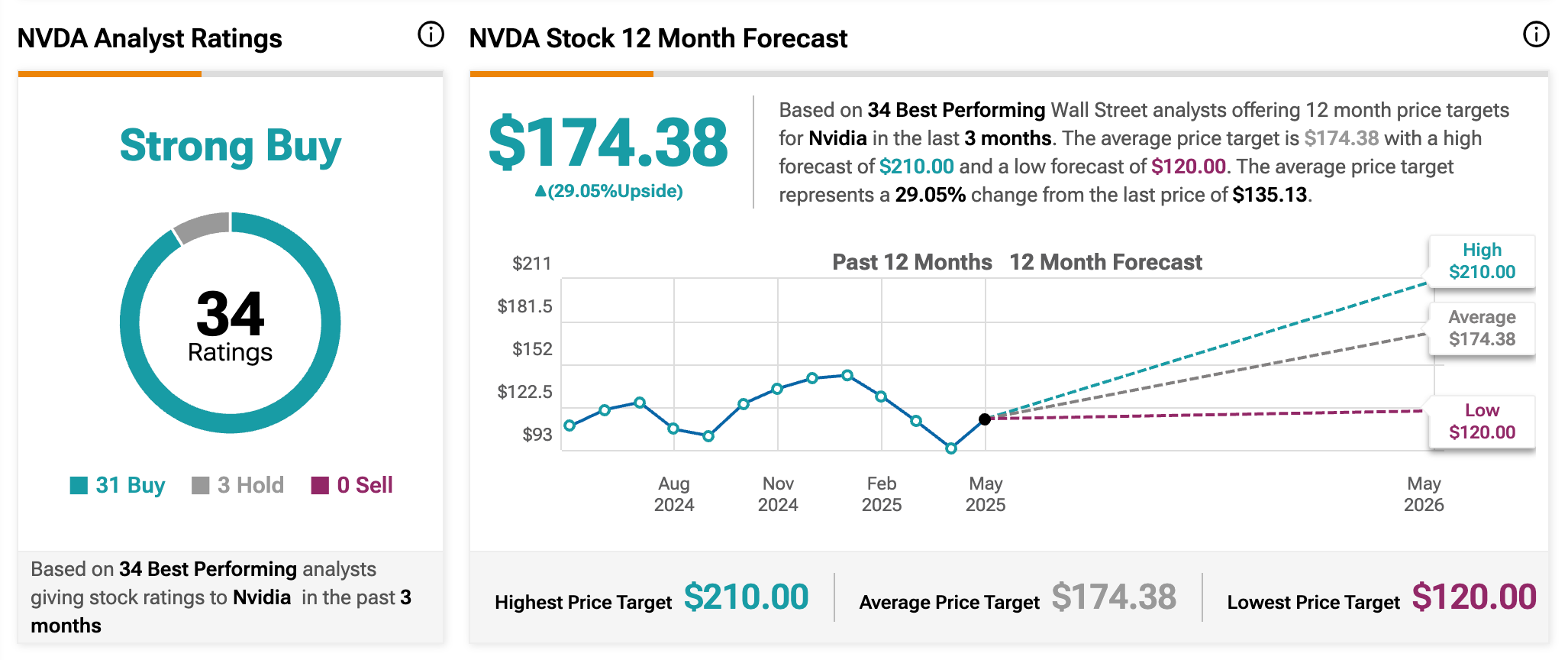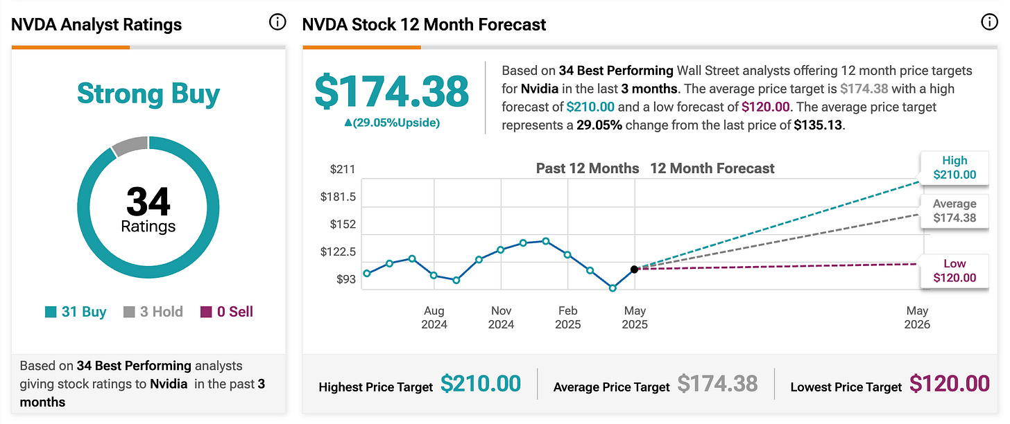 我們同時預計,在公司表現良好下,未來 12 個月的目標價將調高到 175 美元(之前為 168 美元)。今天,34 位「表現良好」的分析師調高了對 Nvidia 未來 12 個月預估的平均價格到 174.38 美元,幾乎與推論一致。