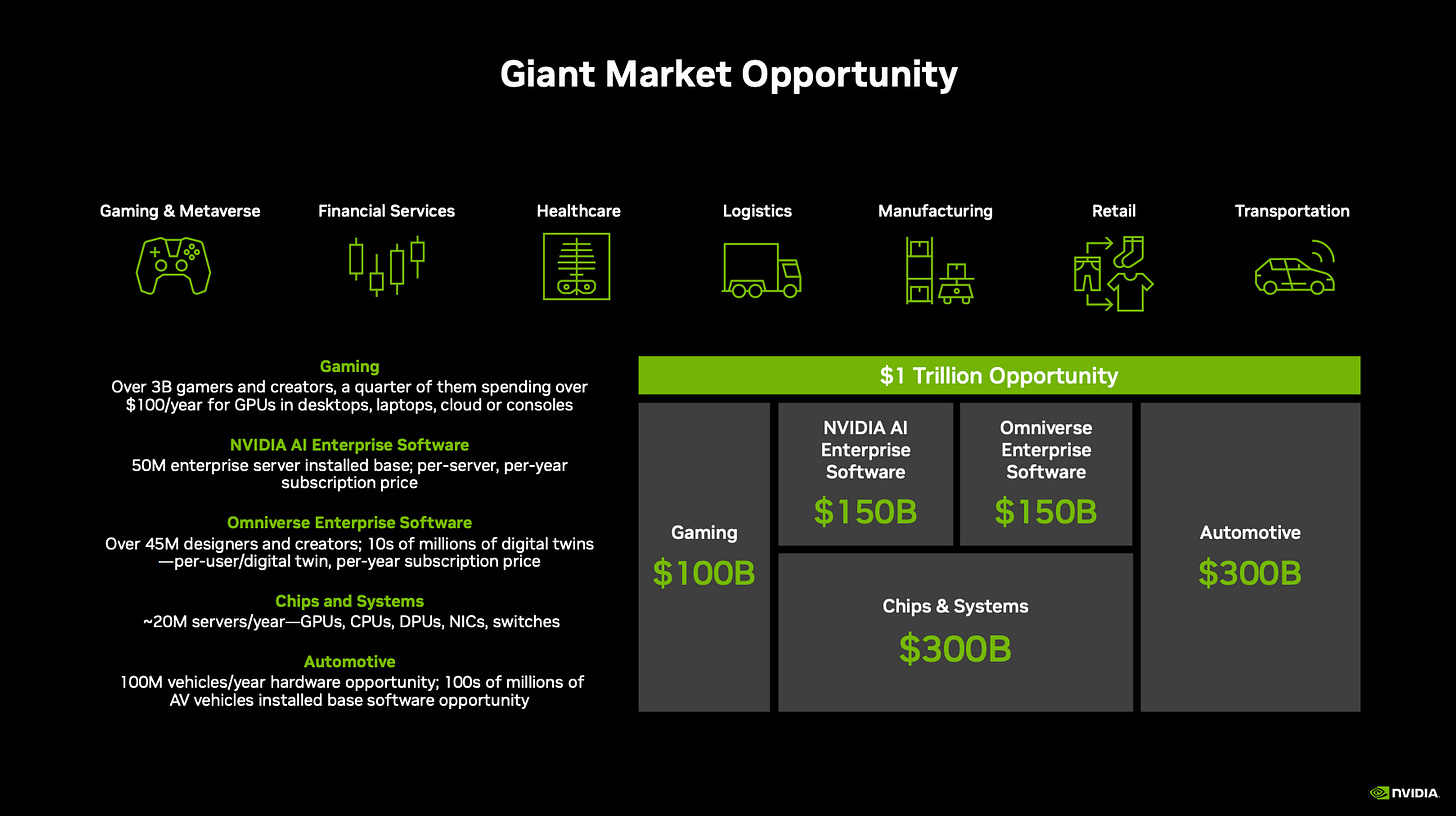 從 Nvidia 內部的營收分類來看,系統與晶片和 AI 企業軟體屬於資料中心業務,目前以大型公有雲客戶、政府與大型公司為主,市場規模共 4,500 億美元。Omnivores 企業軟體屬於視覺專業化(Professional Visualization)部門,針對各個產業數位化的需要,有 1,500 億美元的市場潛能。遊戲為 Nvidia 過去的主力業務,市場規模達 1,000億美元。汽車行業在電動車興起下,擁有 3,000 億美元的市場空間。