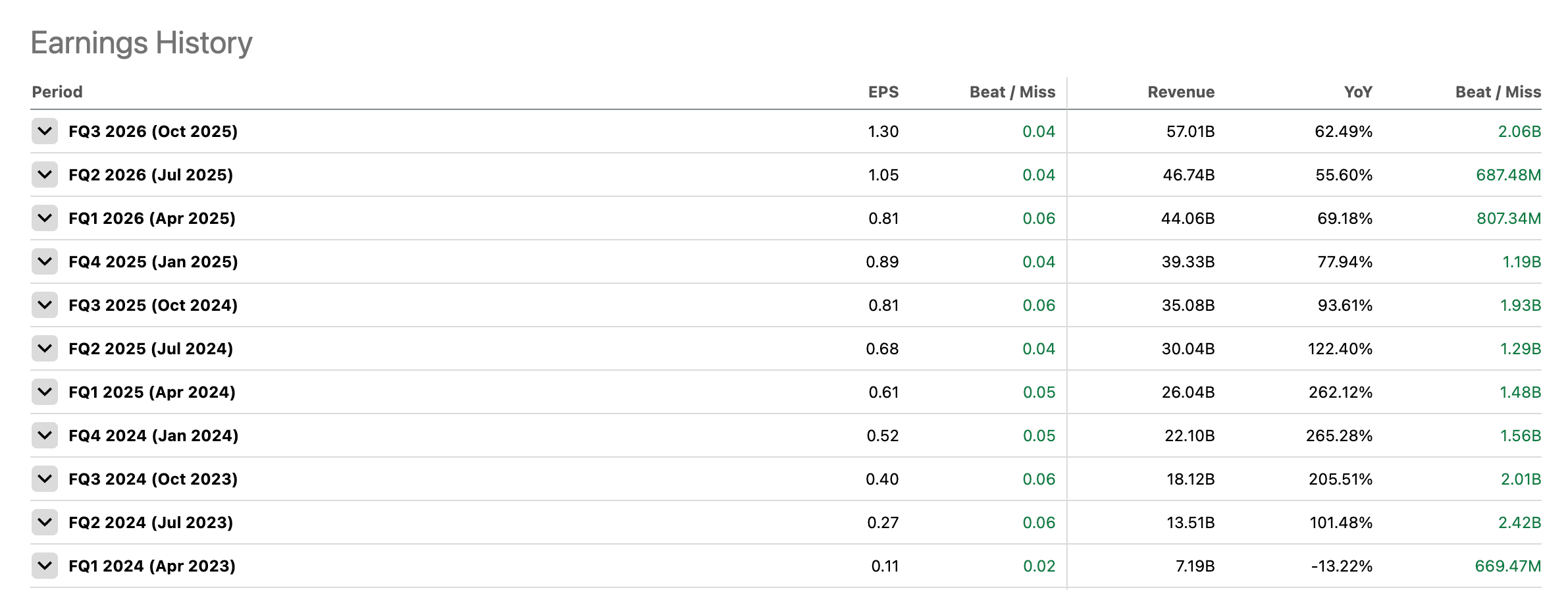 自從 2024 財年以來的 11 個季度,Nvidia 營收獲利持續超預期(表一)。多數分析師認為 Nvidia 會再次「雙超」。Seeking Alpha 上有分析師預測 Q4 營收和 EPS 將分別超出共識約 2.1% 和 1.1%。短期內,投資人除了關注本季數字外,還將特別留意 Blackwell 架構的出貨進度、FY2027 的業績指引展望,以及關稅裁決對供應鏈的潛在影響。