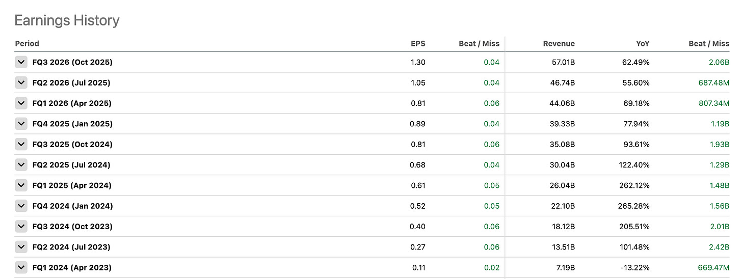 表一 Nvidia 自 2024 財年以來每季的獲利均打敗分析師預期