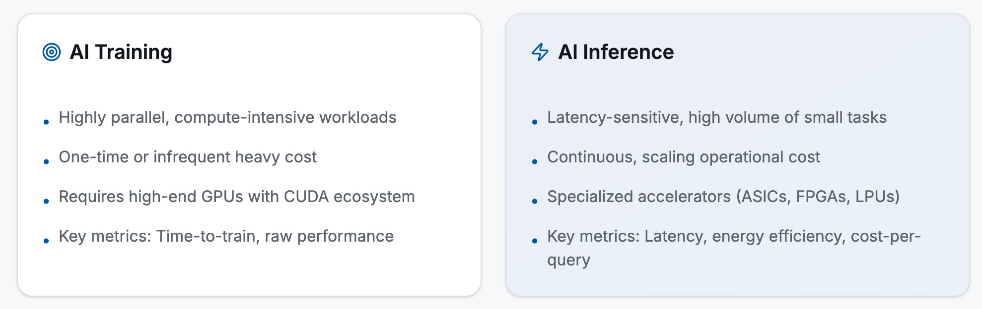 人工智慧行業正在經歷一場根本性的轉變。多年來,投資的主要挑戰和重點一直在於訓練規模更大、更複雜的 AI 模型。這一階段的計算量巨大,而且需要巨大的並行處理能力(highly parallel,compute-intensive)。而在這個領域,Nvidia 的 GPU 和 CUDA 軟體生態系統已經建立了近乎壟斷的地位。然而,隨著 AI 模型的逐漸成熟並被部署於為數百萬用戶提供服務的實際應用中,計算的工作負載正大量向推論轉移,即利用訓練好的模型來「做出預測」或「產生回應」(圖表一)。