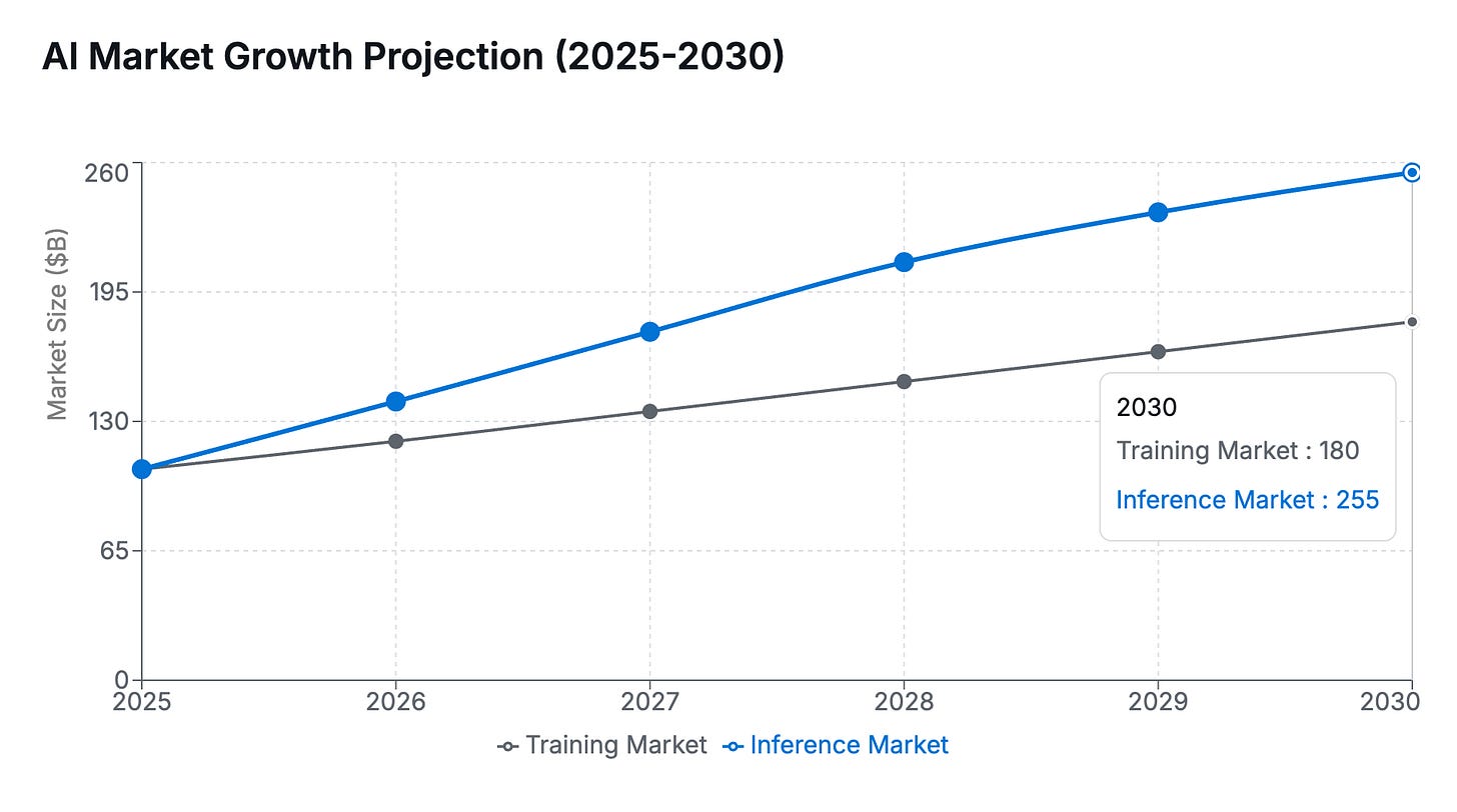 行業分析師預測,在未來幾年,人工智慧推論市場將遠超訓練市場。預計到 2030 年,推論市場的規模將從 2025 年的約 1,060 億美元增長至超過 2,550 億美元(圖表二),部分預測甚至認為推論計算市場最終可能會是訓練市場規模的 10 倍。推動這種轉變的力量來自於:一個模型只需訓練一次,但會被用於推論數十億次。這種新的行業發展趨勢需要一種不同的硬體類別,優先考慮低延遲(low latency)、能源效率(energy efficiency)和每次查詢成本(cost-per-query),而非訓練時所需的原始運算能力。