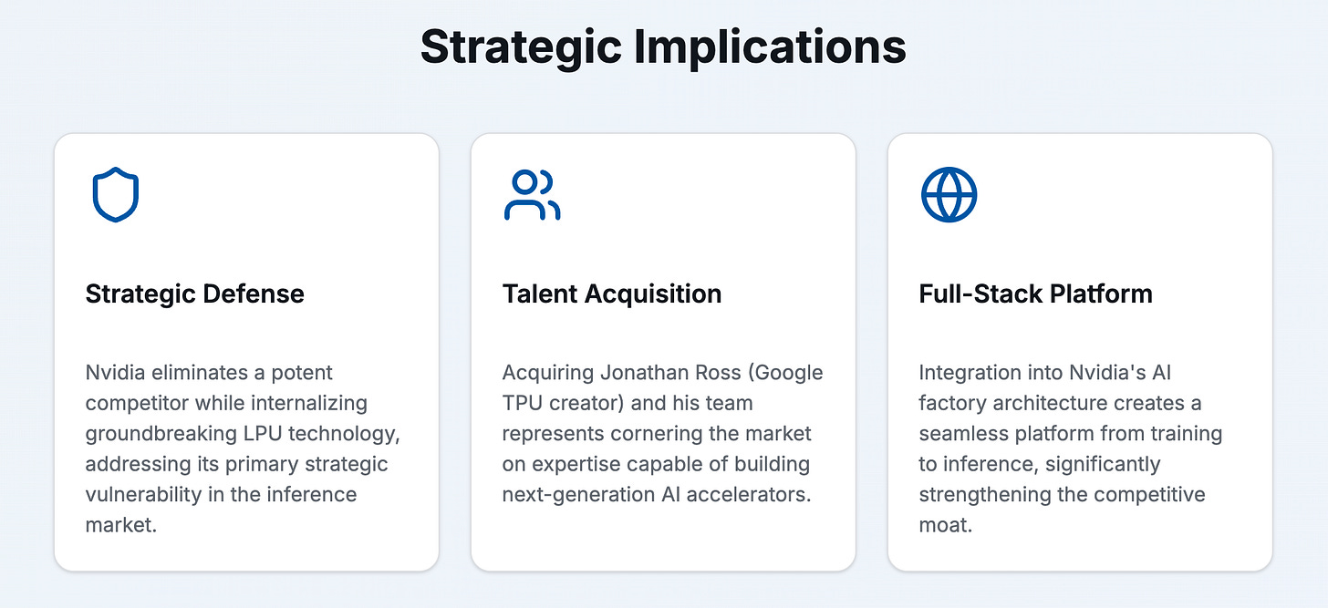 Nvidia 收購 Groq 的資產之舉堪稱企業戰略的典範,它同時解決了技術缺口、消除了競爭威脅,並通過一次決定性的行動成功鎖定了頂尖人才。
