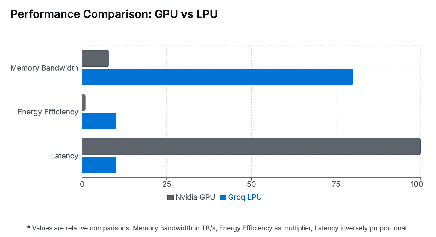 首先,Groq 對 Nvidia 的主導地位構成了長期的威脅。Groq 獨特的語言處理單元(Language Processing Unit,LPU)架構是從零開始專門針對 AI 推論需求而設計。通過收購 Groq 公司,Nvidia 不僅消除了一個強大的競爭對手,還將其開創性的技術納入自身體系。Groq 的 LPU 架構在執行推理任務方面比傳統 GPU 具有顯著優勢,兩者之間的核心技術架構對比分析如下: